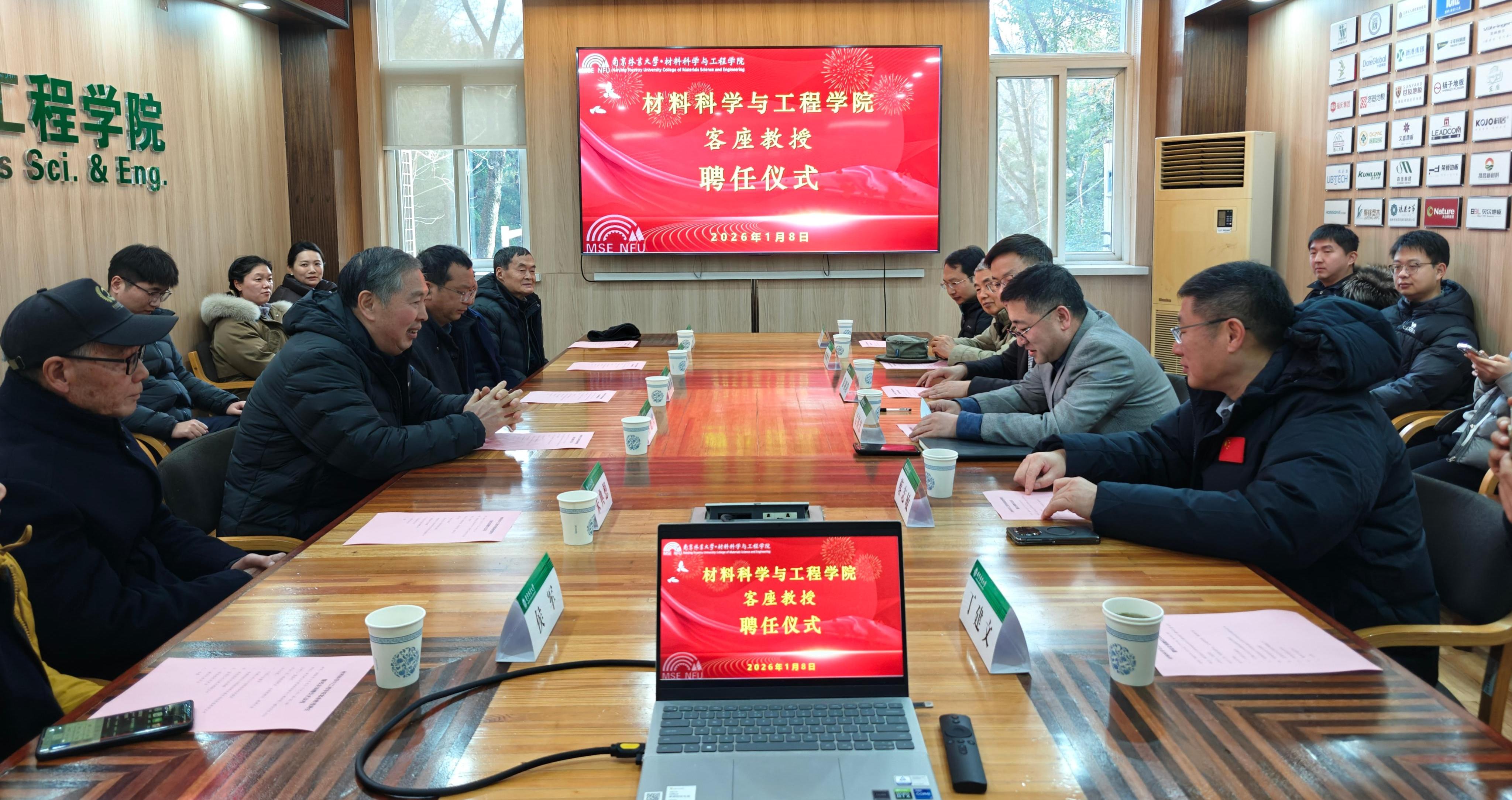 1月8日下午,材料科学与工程学院在二楼会议室4210隆重举行陈胜铭校友客座教授聘任仪式。学院党委书记孟国忠主持仪式,院长徐朝阳、原党委书记石德兴、教师代表及部分师生参加活动。 陈胜铭校友系我院1992级人造板专业优秀毕业生,现任苏州秋山贸易有限公司董事。多年来,他始终心系母校发展,积极为学院建设建言献策。