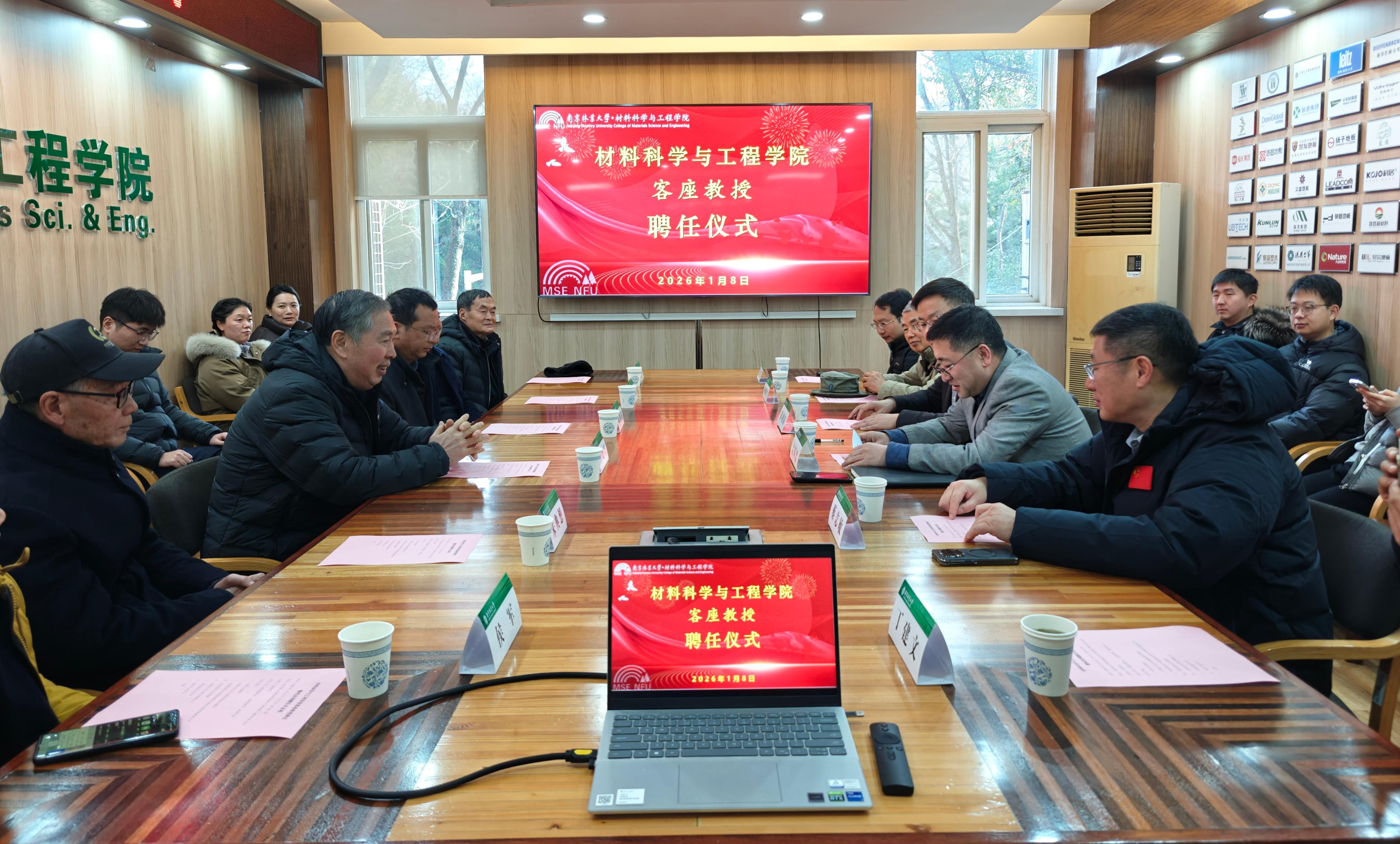 1月8日下午,材料科学与工程学院在二楼会议室4210隆重举行陈胜铭校友客座教授聘任仪式。学院党委书记孟国忠主持仪式,院长徐朝阳、原党委书记石德兴、教师代表及部分师生参加活动。 陈胜铭校友系我院1992级人造板专业优秀毕业生,现任苏州秋山贸易有限公司董事。多年来,他始终心系母校发展,积极为学院建设建言献策。