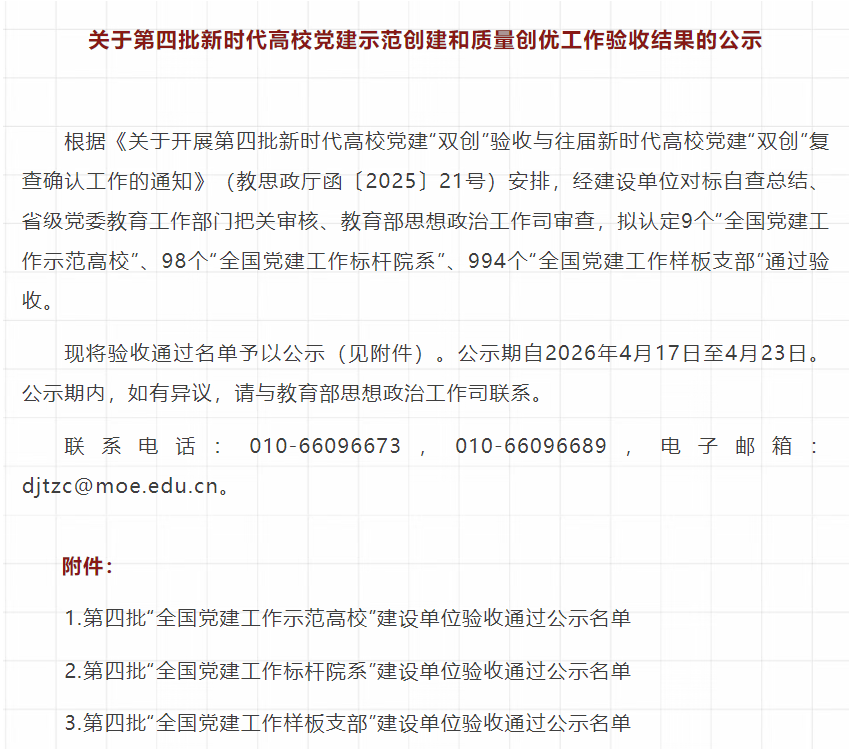 喜报!材料学院党委通过第四批高校党建“双创”验收并获评“优秀”等次 [ 点击次数:次 日期:2026-04-29 ]