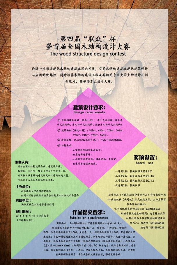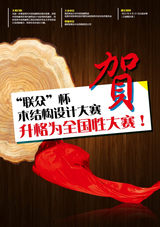 两大亮点将有助于扩大第四届“联众杯”木结构设计大赛的影响范围,期待全国木结构建筑企业、建筑设计院、在读本、专科生、硕士(博士)研究生,以及其他从事木结构建筑研究和工作人员的积极参与。